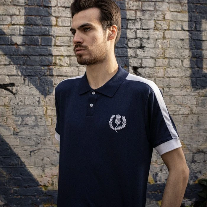 Regular Fit. Embroidered Badge. Ribbed collar. Two-button placket. Short sleeves with a white panel and ribbed armbands.